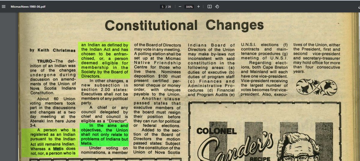Micmac News 1980 - 06 - Constitutional Challenges - A person who is registered as an Indian pursuant to the Indian Act remained Indian Whereas a Metis does not- Aims and Objectives -shall not only relate to probs of Indians but Metis....