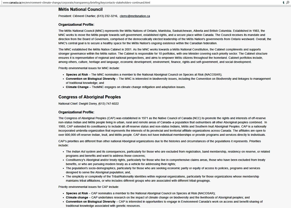 2 national metis groups - MNC and CAP who used to be NCC who repatriated the Metis into the 1982 Constitution, both organizations have an accord with the Canadian Gov to represent Metis peoples.