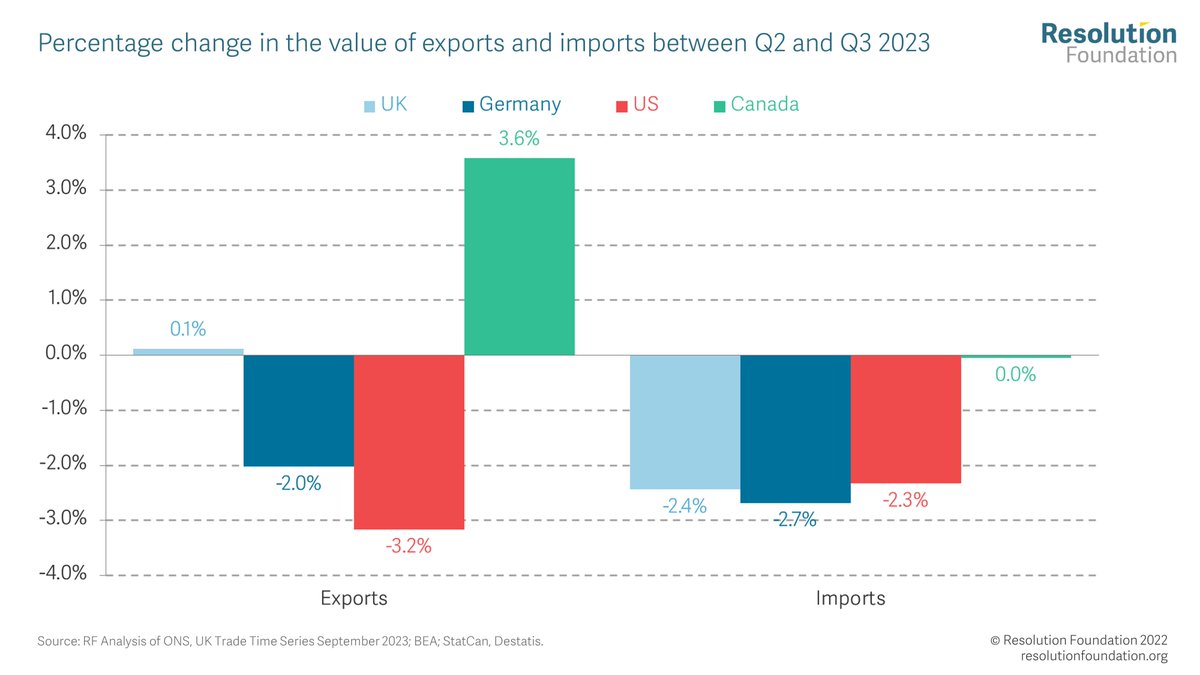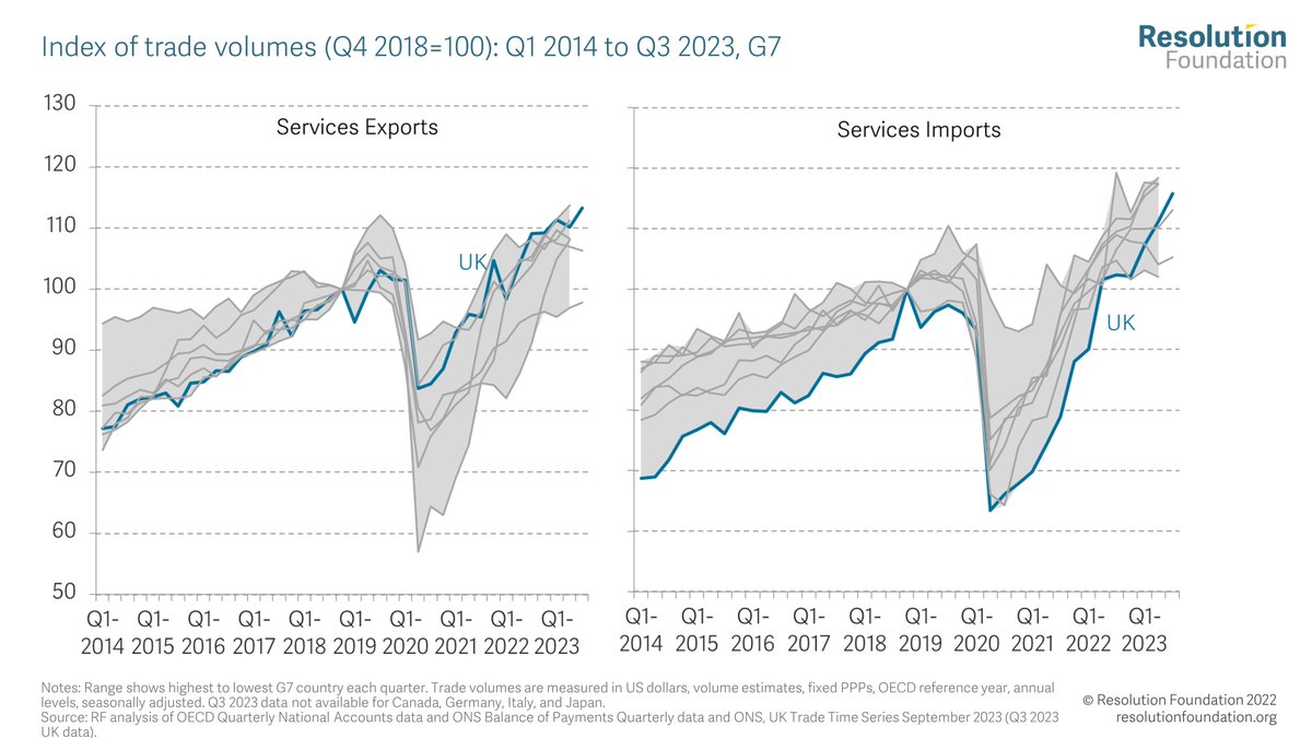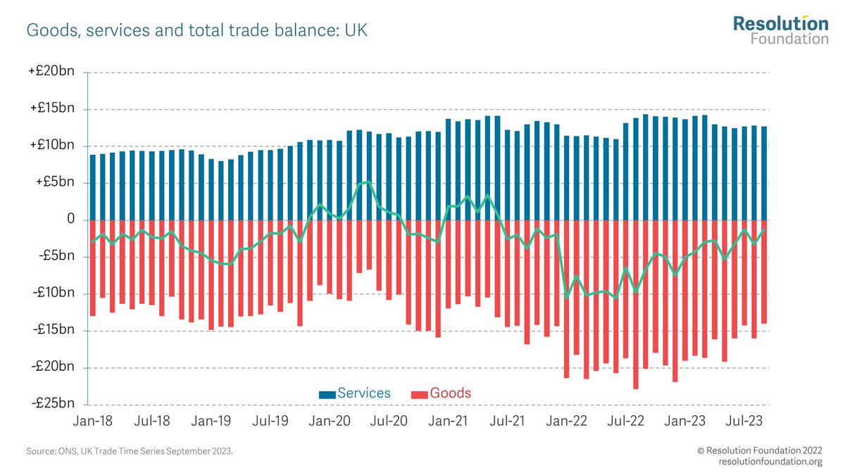@DennisNovy @pmdfoster Overall then Q3 2023 leaves the trade performance picture relatively unchanged, as the impacts of the oil price shock finish working their way through. Goods exports performance remain very weak, while services exports continue to be 'unexpectedly' strong.