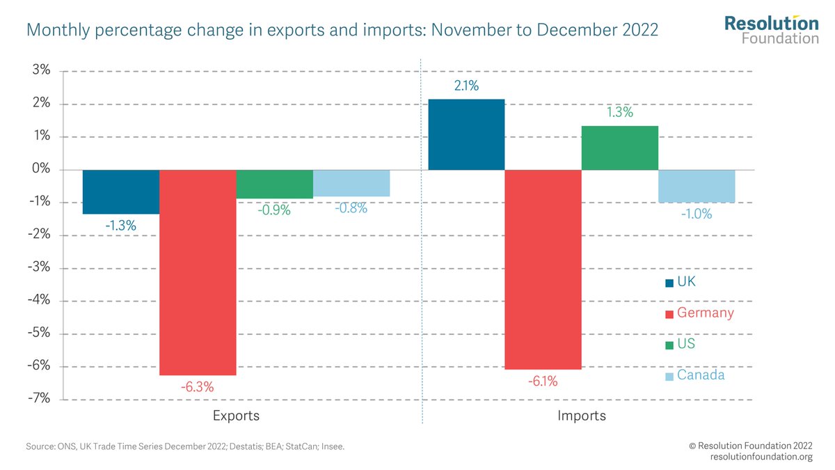 All comparators saw exports fall in December, with UK exports falling more than US and Canada but significantly less than Germany. The UK saw the largest rise in imports.
