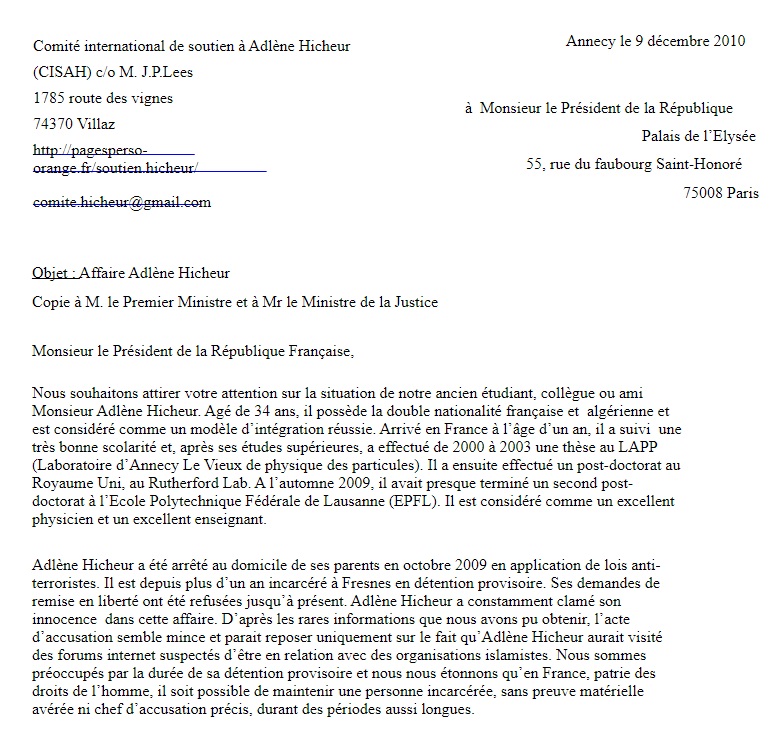 Entre os signatários da carta estava Jean-Pierre Lees, do Laboratório de Annecy-le-Vieux, que afirmou que os promotores "sabem muito bem que ele não fez nada". Segundo Lee, Hicheur foi usado como exemplo p/ criminalizar e desumanizar os muçulmanos de alto nível educacional