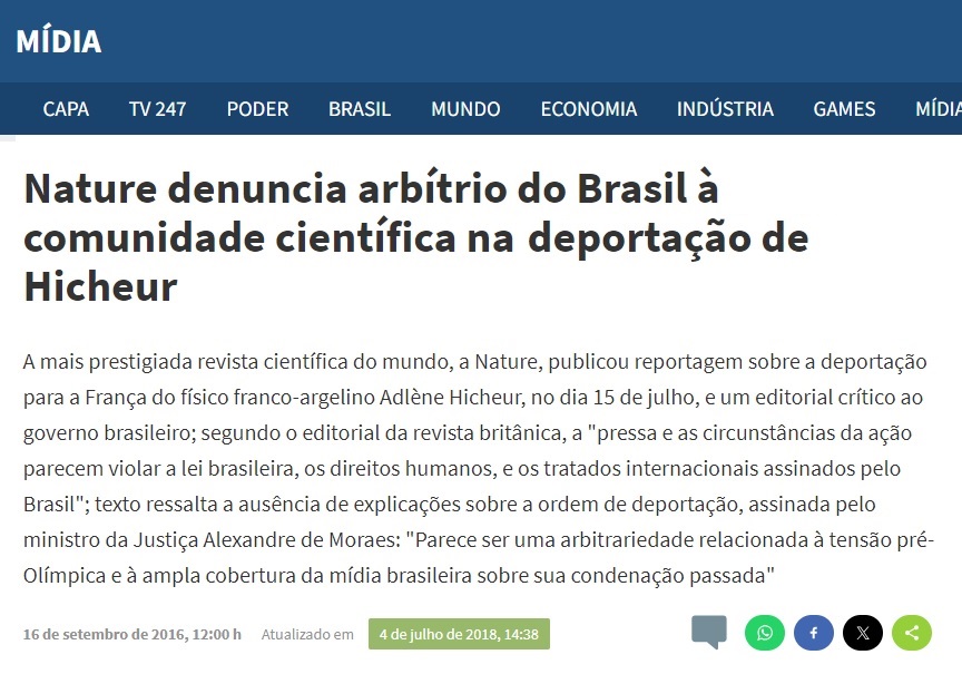 Vocês lembram do caso do professor Adlène Hicheur? Ele é um renomado físico de partículas argelino que atuou como pesquisador no CERN. Em 2013, ele veio pro Brasil e passou a lecionar na UFRJ. Até ter sua carreira destruída por uma matéria da revista Época, da Editora Globo