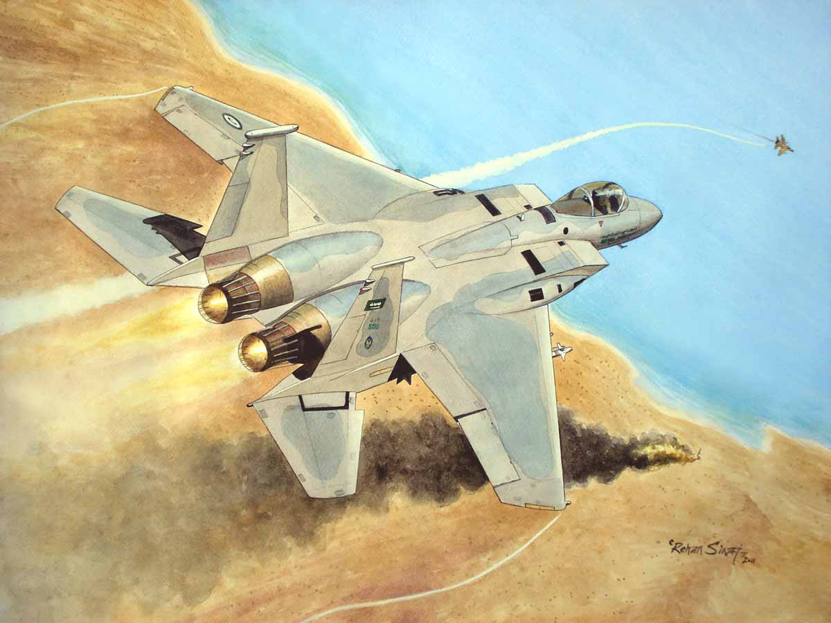 Ahora, sin embargo, todo depende de los cuatro F-15C del 13º Escuadrón de la RSAF que, siguiendo las intrucciones del E-3, giran hacia la costa para interceptar a los iraquíes. Por si acaso, el AWACS contacta con dos AV-8B Harrier del USMC para que pongan rumbo hacia los Mirage.