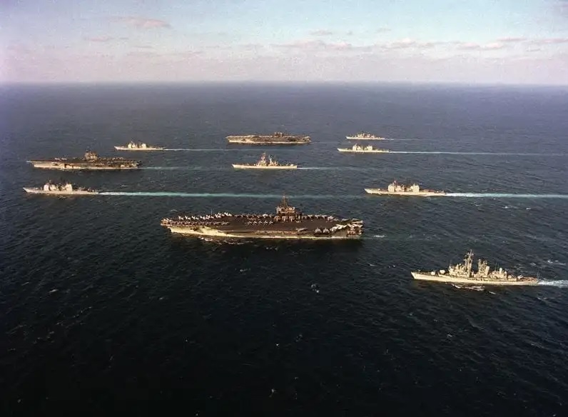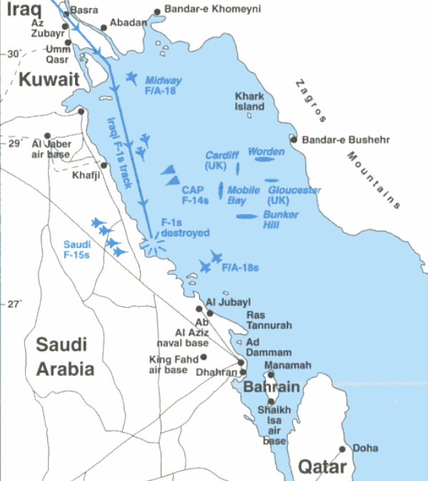 En ese momento, en el Golfo navega la TF-154 con los portaaviones USS Midway, USS Ranger, USS América y USS Roosevelt. En la zona hay otros 21 barcos de guerra de EEUU, Gran Bretaña y otros aliados, incluidos dos cruceros tipo Ticonderoga, con su afamado sistema de combate AEGIS.