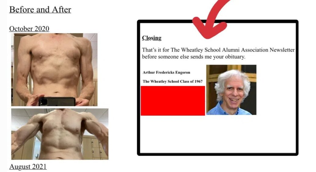 In this edition, Judge Engoron included a "BonusTorsoPhoto," a strange supplement that showed a starved torso, thought to be his own. Many have questioned the appropriateness of such information in a school alumni newsletter as a result of this atypical editorial choice.