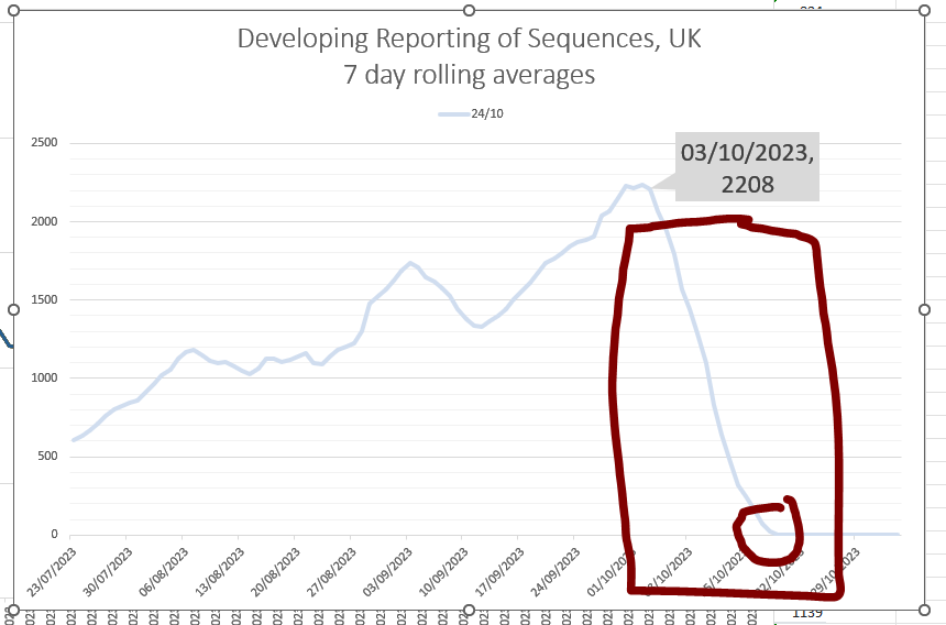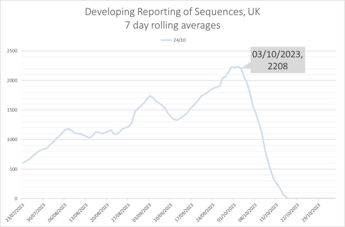 Here's a snapshot of the data shared on the 24th October. It's the rolling total of how many sequences were done in the previous 7 days. If you look at the callout, you'll see that by the 24th, they had reported 2208 sequences in the previous 7 days (27th Sept - 3rd Oct).