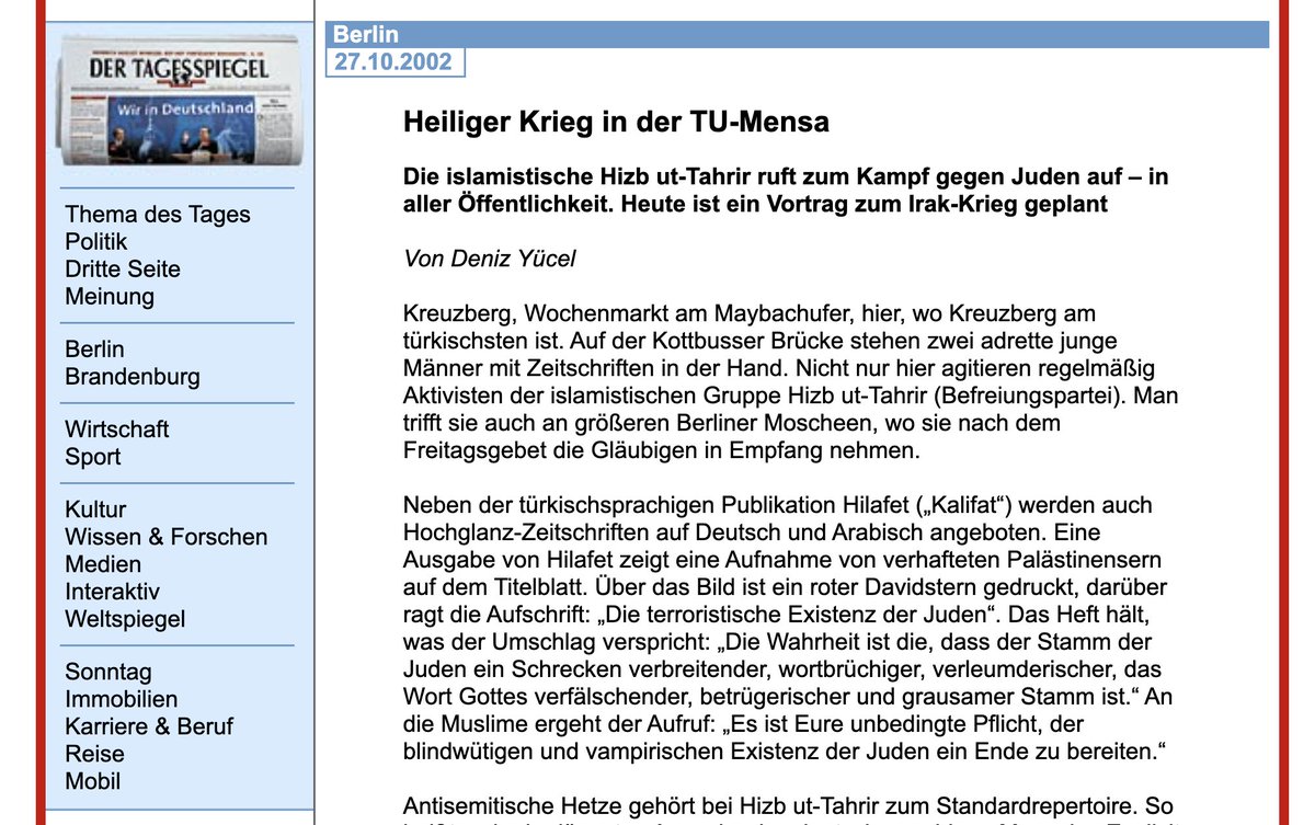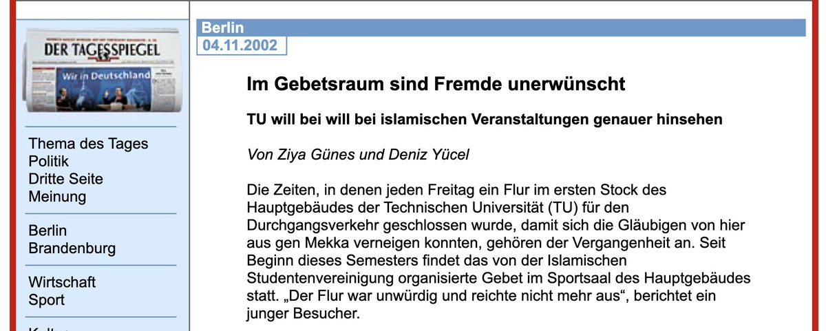 Ich hatte damals, also 2002, eine halbe Stelle bei @Jungle_World und arbeitete nebenher frei. Diese Story bot ich dem @Tagesspiegel an und schrieb einige Texte über Hizbut-Tahrir. Dafür besuchte ich auch das Freitagsgebet an der TU, das die Gruppe zu unterwandern versuchte. /11