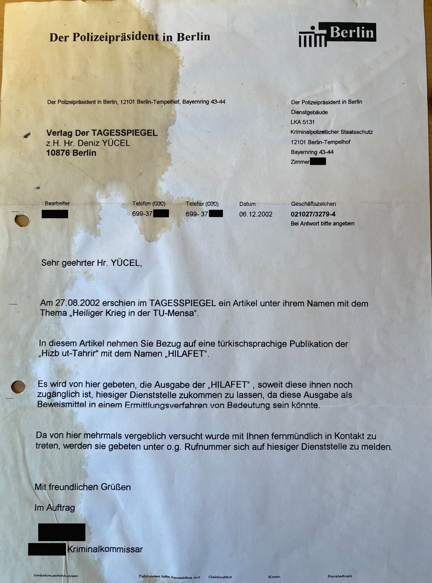 (Dieses Schreiben des LKA, in dem übrigens der besagte Tagesspiegel-Artikel falsch datiert ist, hat die Jahre überdauert. Mit Kaffeefleck, aber immerhin. 👇) /24