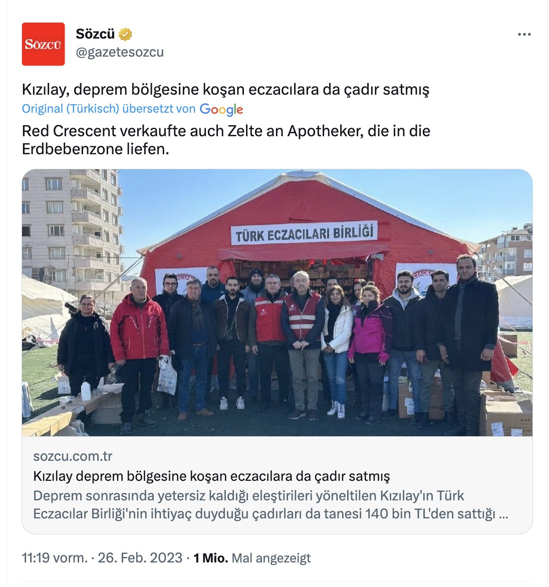 2- Am Sonntag berichtete der Journalist @muratagirel in der Tageszeitung @cumhuriyet, dass der Türk. Rote Halbmond drei Tage nach der Erdbebenkatastrophe an die Hilfsorganisation @ahbap 2.050 Zelte für umgerechnet knapp 2,3 Millionen Euro verkauft habe. faz.net/aktuell/gesell…