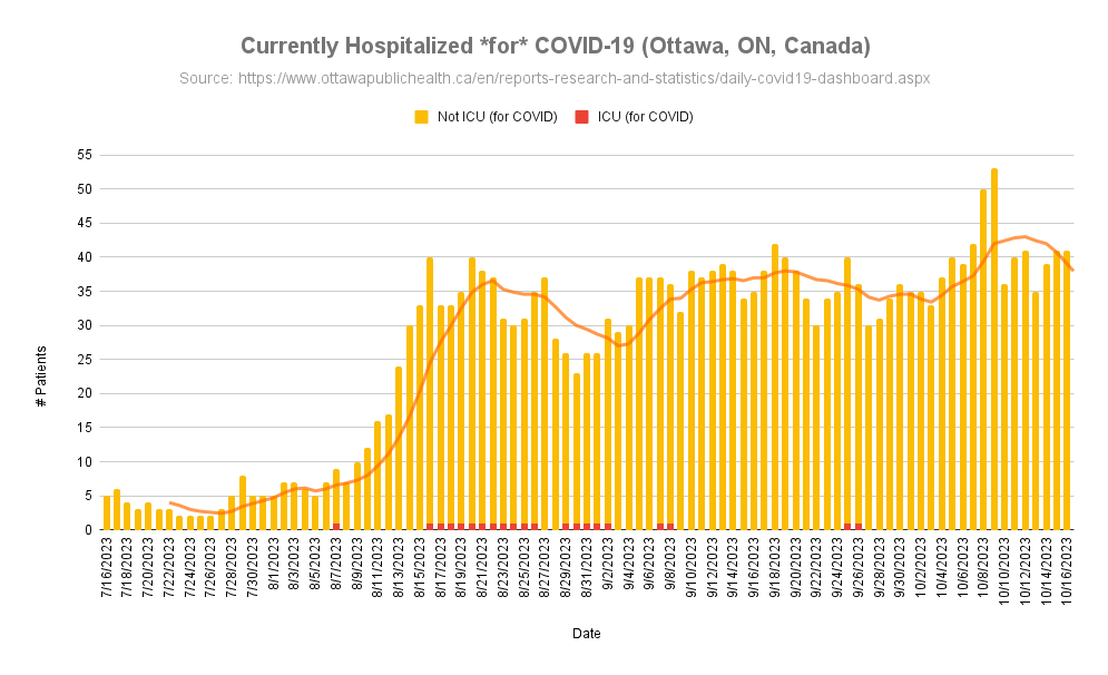 Unfortunately that means increases in hospitalization as well. Ottawa has had significantly elevated levels of hospitalization *for* COVID-19 during the past 2 months now. 2/