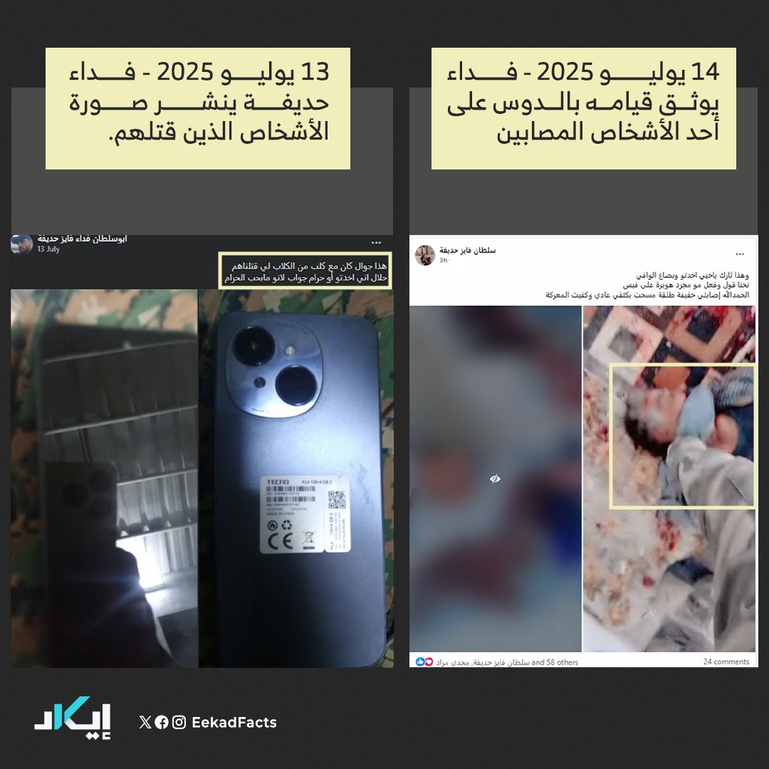 🔻كما نشر في اليوم التالي 14 يوليو مقطعًا له وهو يُمثّل بجُثثٍ مجهولة لا تحمل هوية عسكرية، ونشر أيضًا صورةً له في نفس اليوم وهو يدوس على شخص مصاب وقام بحذفها لاحقًا، وهو المقطع ذاته الذي نشره أحد أصدقاء فداء على فيسبوك باسم Warood Molla.