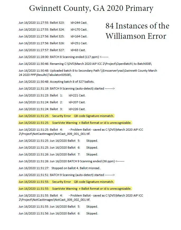9/ The Elections Oversight Group () analyzed the system log files for 66 Georgia counties (acquired through Open Records Requests). In **64 out of 66 counties**, they found the same error messages as Williamson.