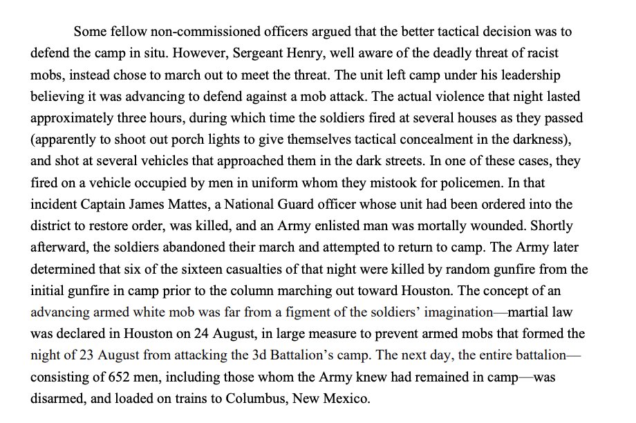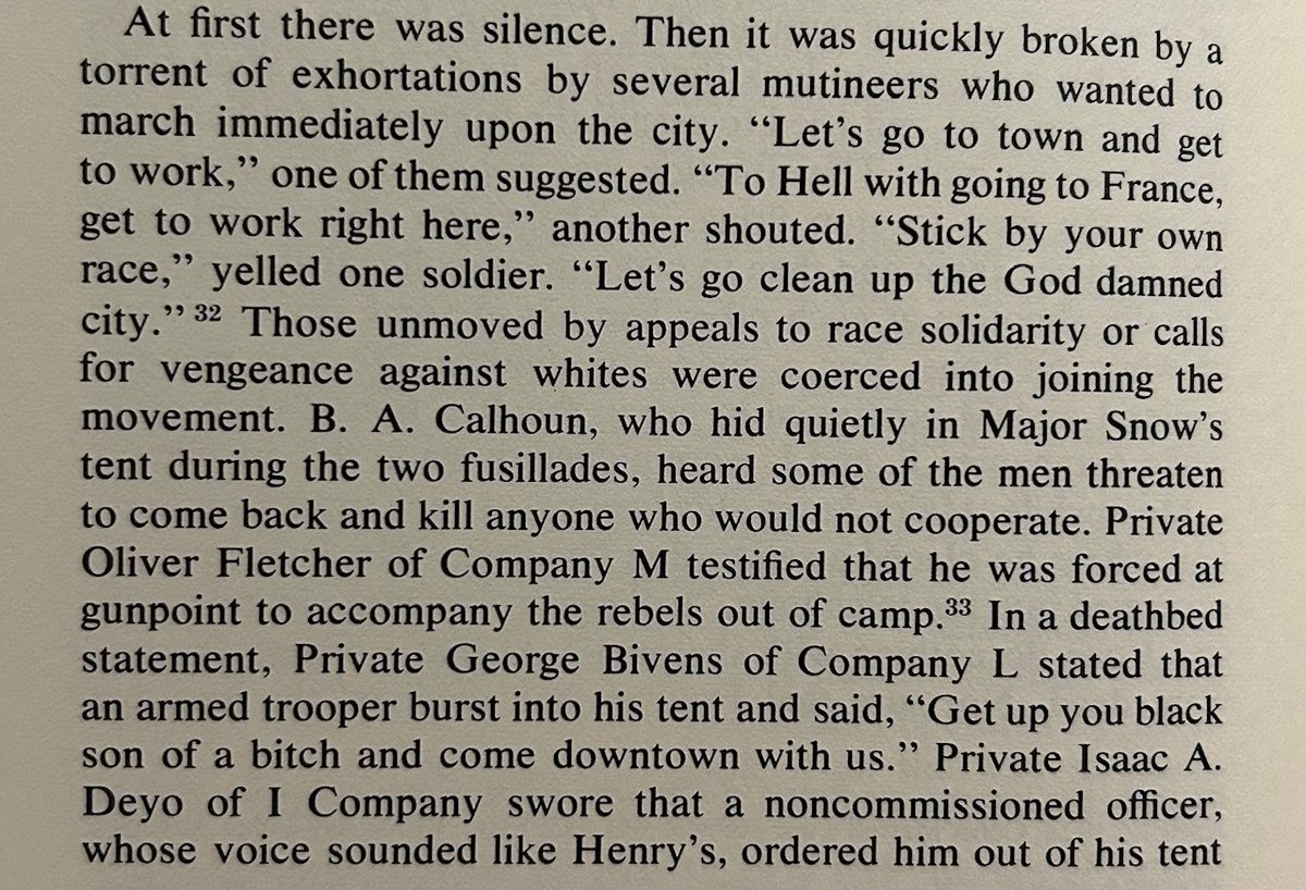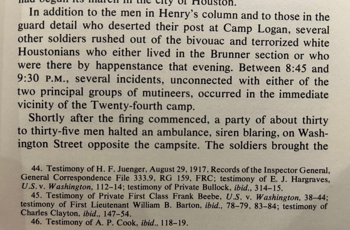 Thread with details on the Houston Mutinty of 1917, including the murder of civilians. "Each shot seemed to be followed with a sickening thud as if they were pounding him with clubs."