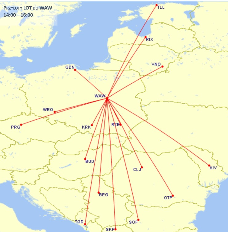 Przykład WAW: 13 rejsów LOT ląduje 0615-0640 rano, przywożąc pasażerów z CEE. W godzinach 0715-0805 aż 21 rejsów LOT wylatuje do Europy Zachodniej