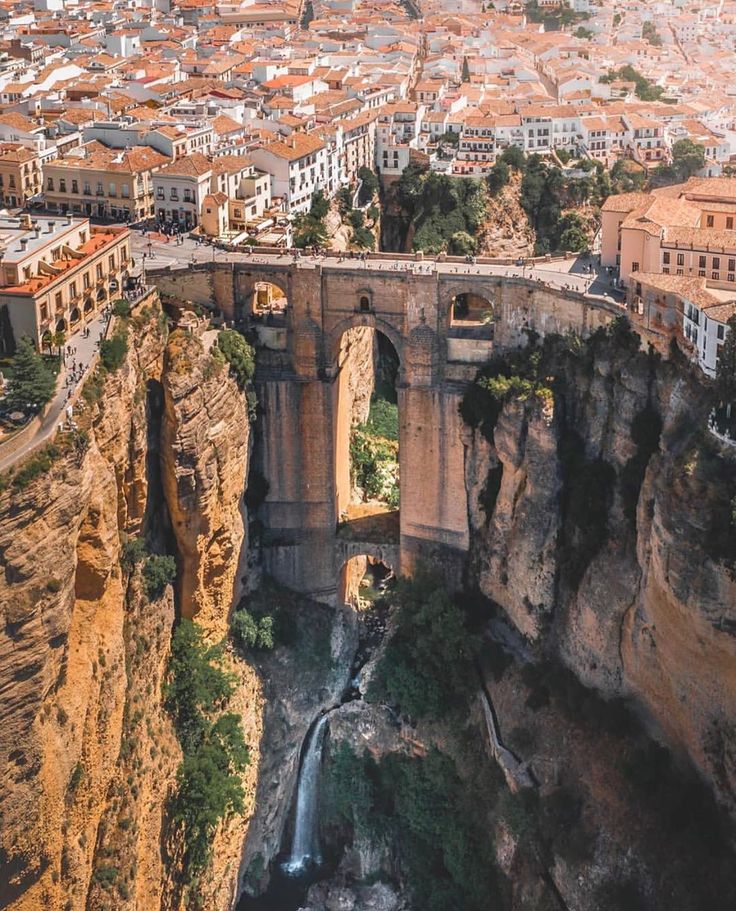 A spectacular bridge crossing a 390 ft chasm of the Guadalevín River in southern Spain, connecting the town of Ronda. The chamber above the central arch was once used as a prison and torture chamber.