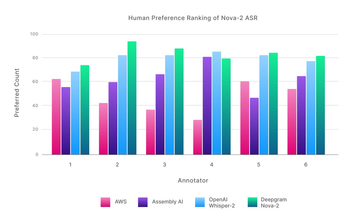 In head-to-head comparisons, Nova-2 transcripts were preferred ~60% of the time, and 5/6 annotators preferred formatted Nova-2 results more than any other vendor. Nova-2 had the highest overall win rate at 42%, which is a 34% higher win rate than the next-best OpenAI Whisper[2].