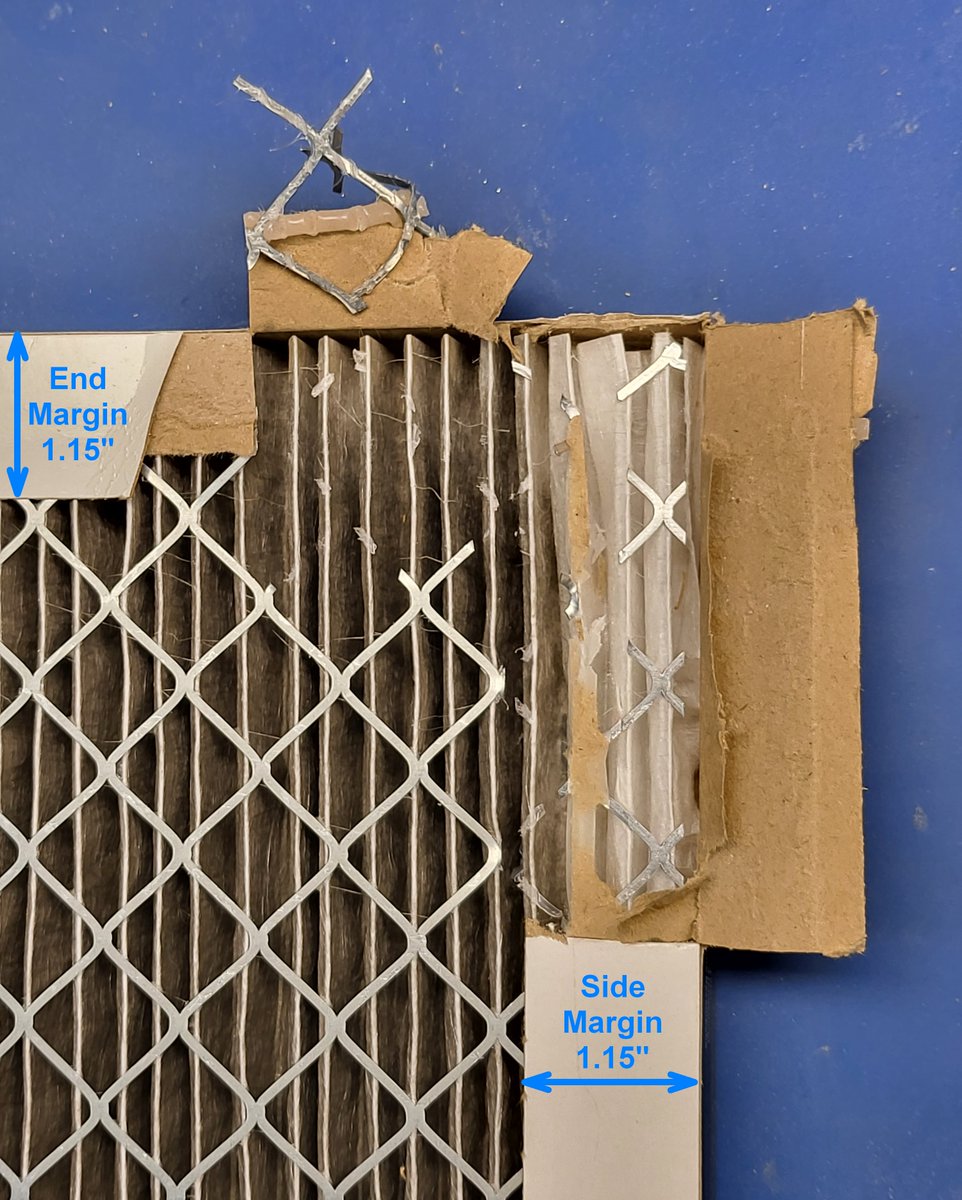 @blouisBLT asked some useful questions about the way I calculated Aeff, which prompted me to autopsy a used @3M Filtrete 2800. Side margins blocks all the pleats they cover (give or take a pleat), as I conjectured. But end margins do shield about half what they cover. Click ALTs.