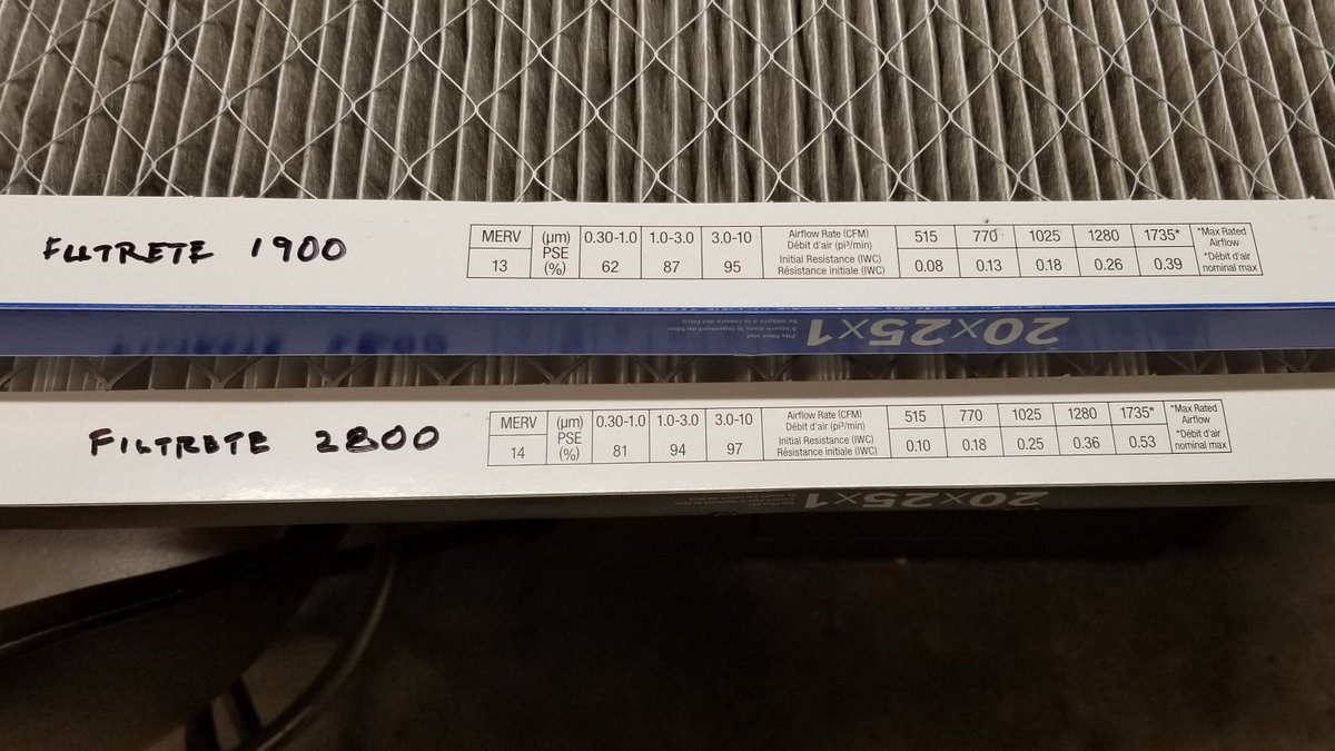 I dunno why the 2500 is different. The 2nd table in this figure is for slightly different size filters and more fan power. (Rob posted his data for this before the 4-filter runs.) The 2nd table is another look at 1900 and 2500. This time the 2500 did improve at low (62) FPM.