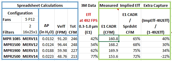 So, I used his CADR and the F&F_16 Tot CFM to get an implied ImpEff. As the table shows, ImpEff is higher than 3M got at 492 FPS, prolly because V is lower, and particles dawdle among those sticky fibers. Except the MPR2500 MERV14, where it’s a bit smaller. Click ALT for more.