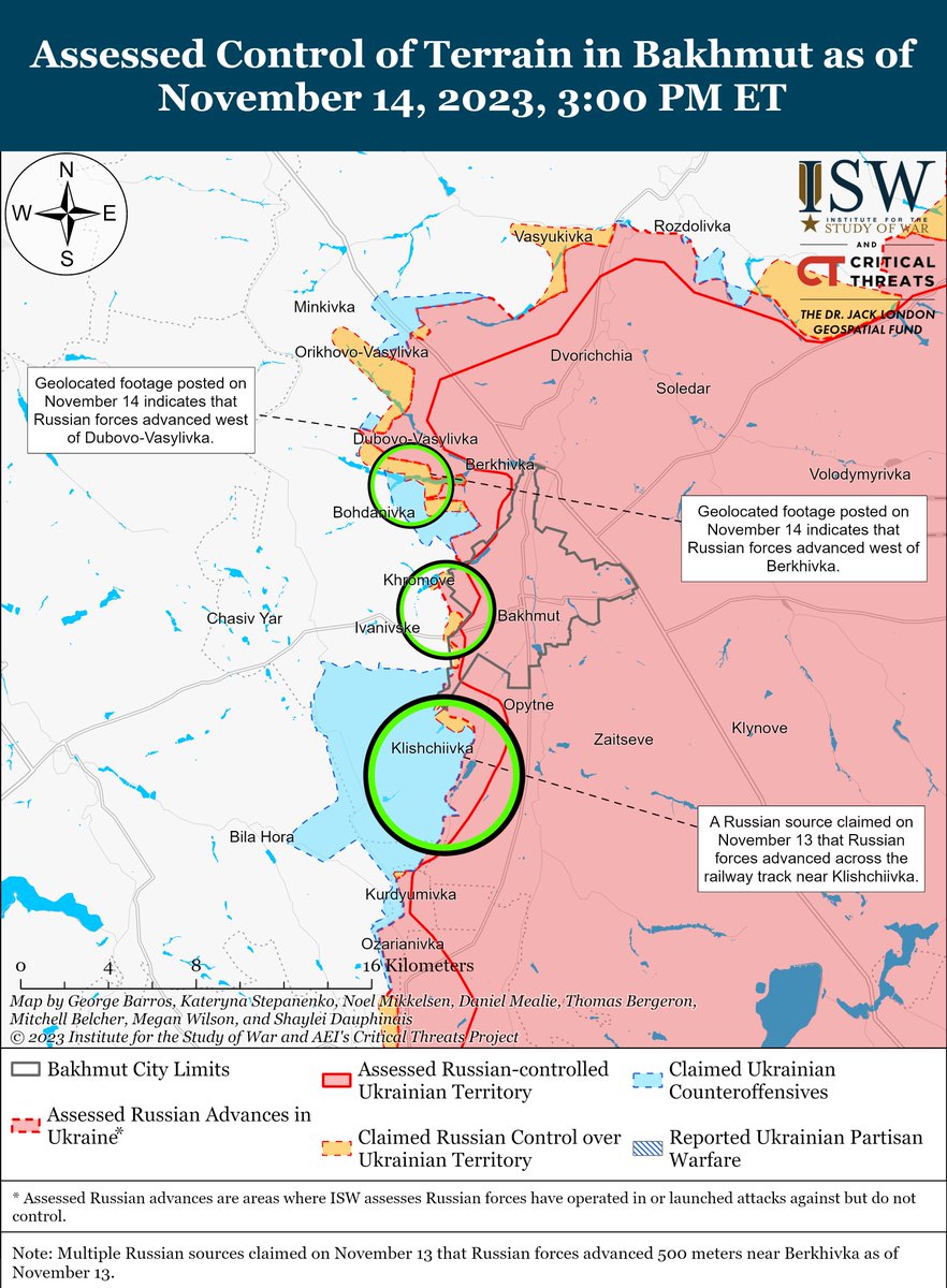 2/ Russian forces continued offensive operations near #Bakhmut on November 14 & made confirmed advances. Geolocated footage published on November 14 shows that Russian forces have made gains north of the Berkhivka Reservoir, about 5km northwest of Bakhmut. isw.pub/UkrWar111423