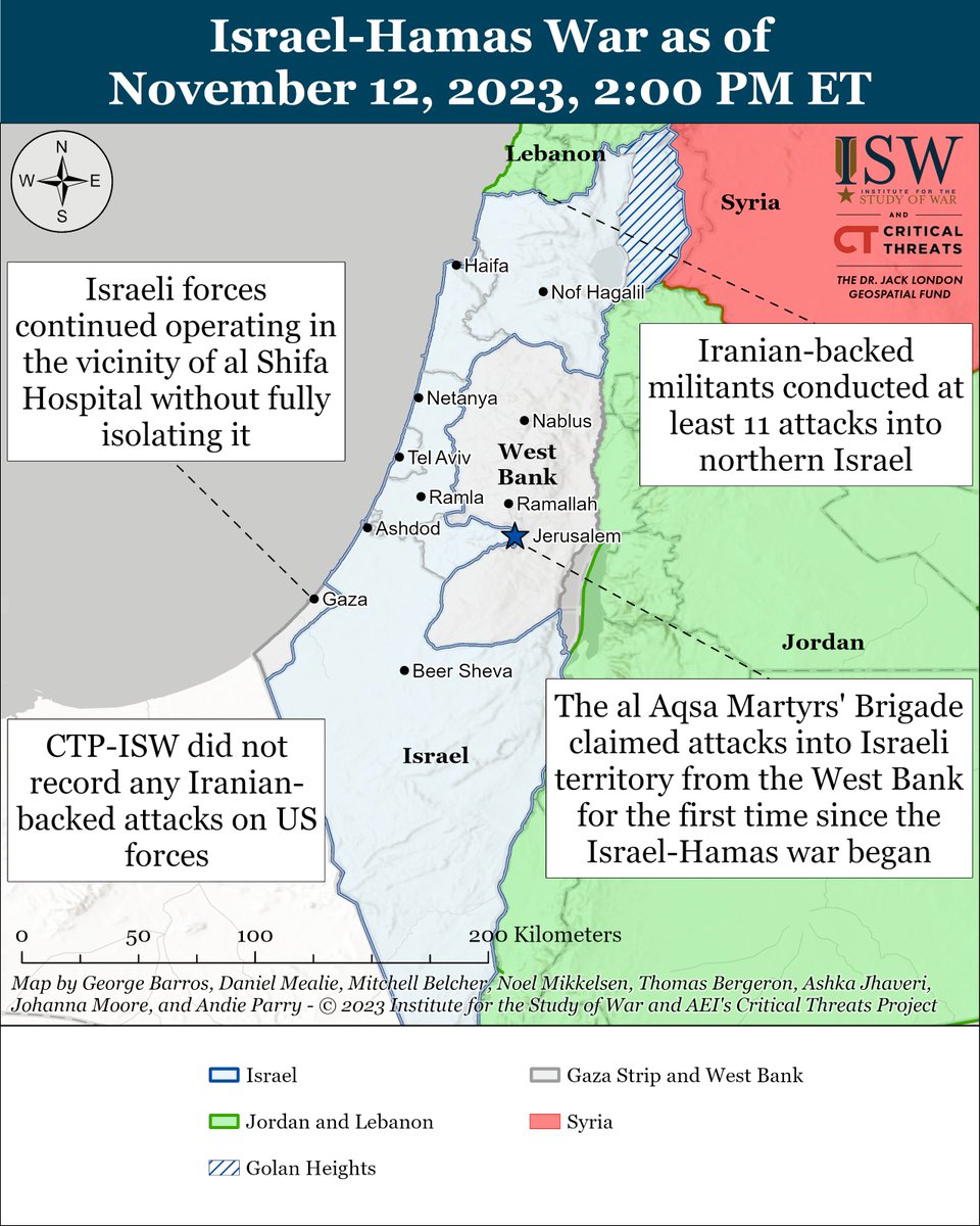 1/ Israeli forces advanced further into the al Nasr neighborhood in the northwestern #Gaza Strip & fought with Palestinian militia fighters at the al Quds Hospital in southwestern Gaza City. isw.pub/IranUpdate1113…
