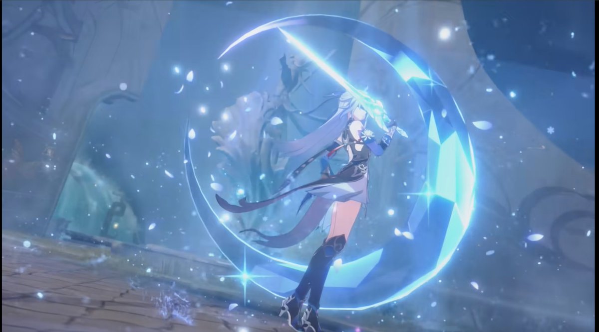 1. Taking a closer look at her animation, you will see that her sword is literally made out of ice. Literally she summons a moon and throws pieces of it at the enemies.