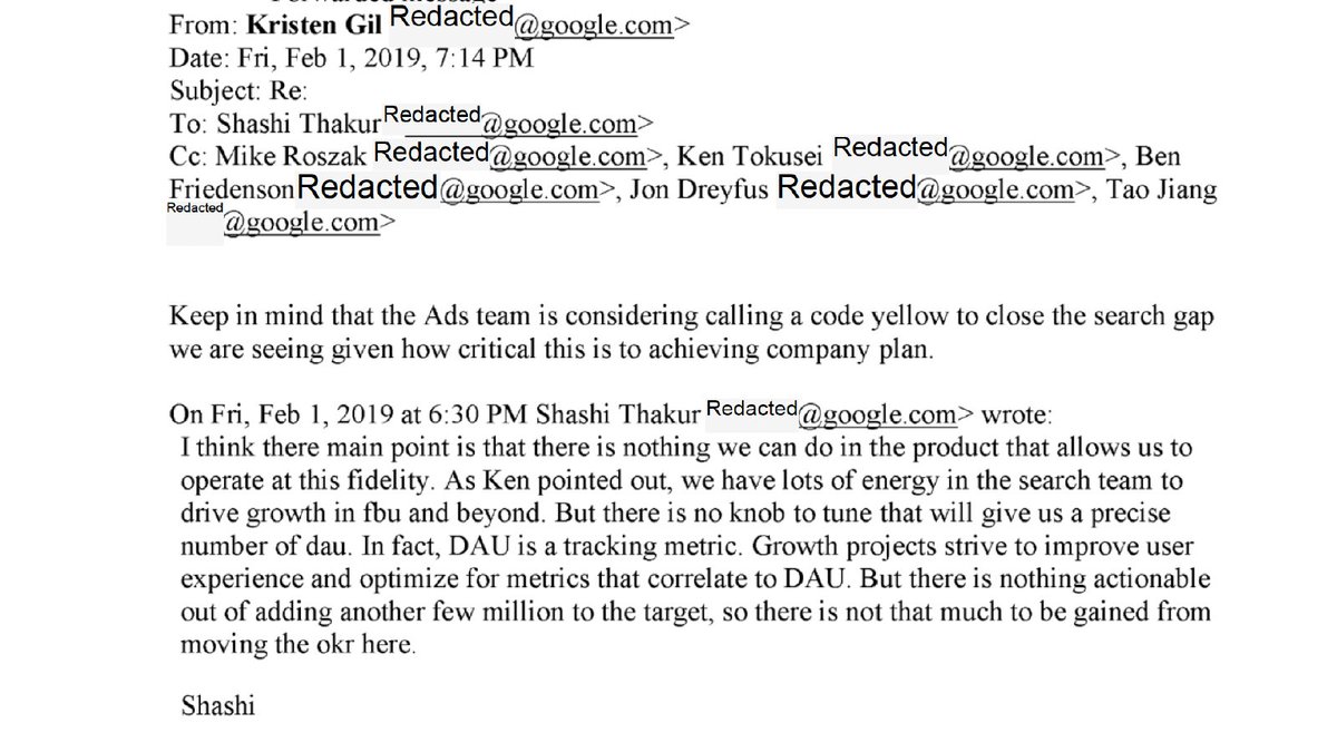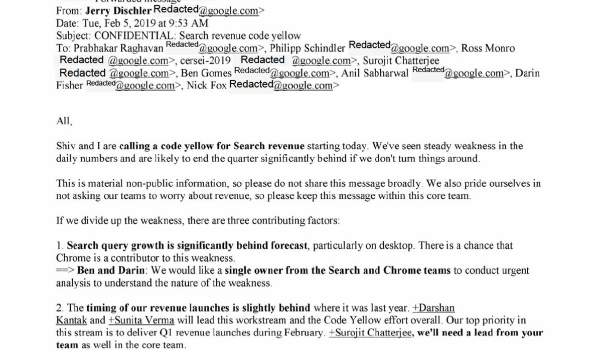 USA v Google. Incoming - Justice Dept just posted 14 more exhibits. This includes the "CY" (aka "Code Yellow") to scramble the jets across leadership to hit OKRs (aka Objectives and Key Results). tl;dr... G was very behind and concerned in Q1 2019. /1