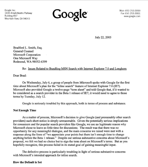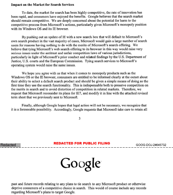 These are the key paragraphs of (threat) letter revealed yesterday from Google to Microsoft when it found out MSFT would make its search engine the default in its new browser. Google's statements on power of defaults vs user choice undermine much of its defense to date. /2