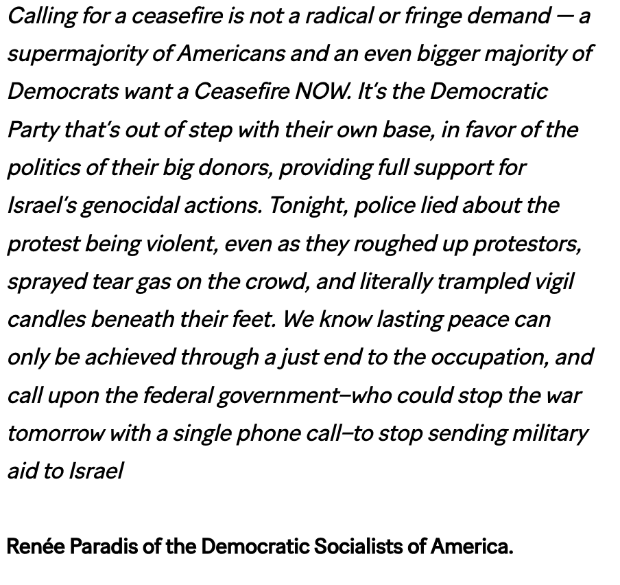 "Calling for a ceasefire is not a radical or fringe demand — a supermajority of Americans and an even bigger majority of Democrats want a Ceasefire NOW" said Renée Paradis of @DemSocialists