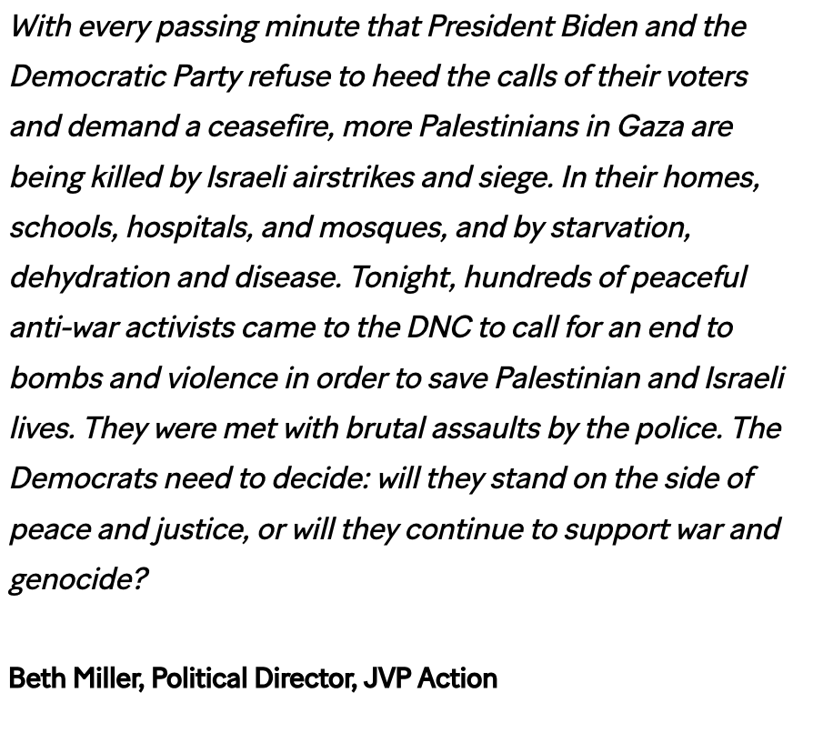 "With every passing minute that President Biden and the Democratic Party refuse to heed the calls of their voters and demand a ceasefire, more Palestinians in Gaza are being killed by Israeli airstrikes and siege" said @bethavemiller political director with @JvpAction
