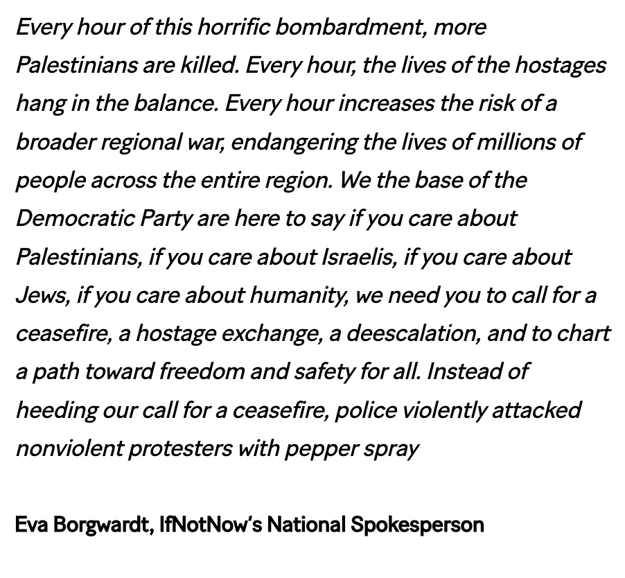 "We the base of the Democratic Party are here to say if you care about Palestinians, if you care about Israelis, if you care about Jews, if you care about humanity, we need you to call for a ceasefire, a hostage exchange" said @EvaBorgwardt national spokesperson with @IfNotNowOrg