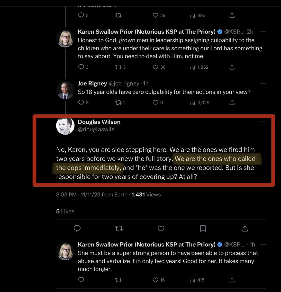 Doug Wilson: “We are the ones who called the cops immediately.”