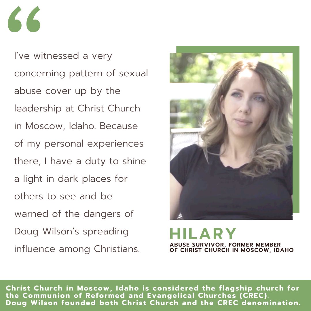 Hilary: “I’ve witnessed a very concerning pattern of sexual abuse cover up by the leadership at Christ Church. Because of my personal experiences there, I have a duty to shine a light in dark places for others to see and be warned of the dangers of Doug Wilson’s spreading influence among Christians.”