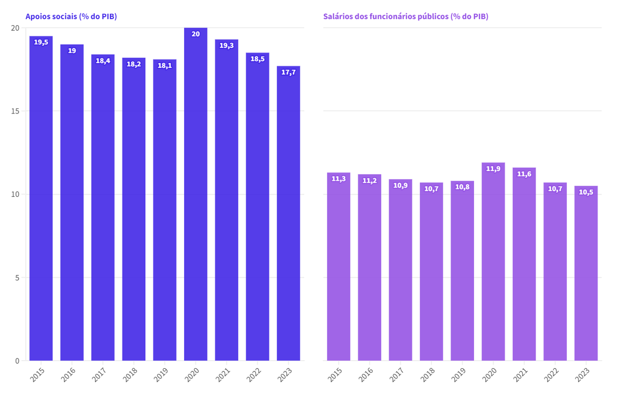 A história é mais relevante do lado da despesa. As duas maiores rubricas são estes dois clássicos. Apesar da pressão nas pensões de velhice, os apoios sociais têm perdido peso. As despesas com pessoal estão mais estáveis, mas também perderam relevância