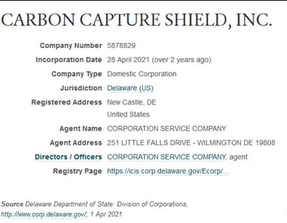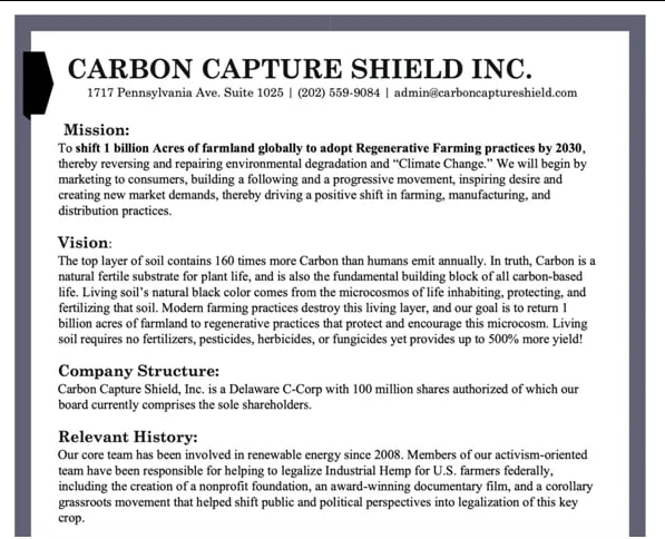 Carbon Capture Shield Inc. is a company that seems to be focused on environmental solutions, particularly in the area of carbon capture, which is a process of capturing carbon dioxide emissions from sources like power plants and preventing them from entering the atmosphere. The company states that they are aiming to become Earth's natural defense against pollution and human activity.