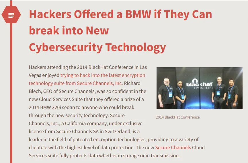 In 2014, Secure Channels and CEO Richard Blech announced a competition. The company claimed to have created an unbreakable and unhackable file. The competition was for a cash prize and a brand new BMW to anyone who could break it.