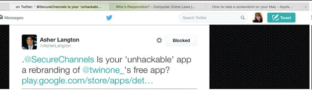 When INFOSEC expert Asher Langton started calling out Secure Channels for being a fraud and pointing out a serious security risk, new Twitter profiles started attacking him. It turned out that one of these brand new anonymous Twitter accounts was Deidre "Dee" Murphy, the Director of Marketing for Secure Channels. These tweets claimed, among other things, that Asher Langton had engaged in criminal copyright infringement by posting up snippets of Secure Channels code.
