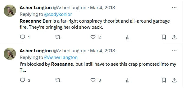 Now this is what I really found strange. At the same time this group went after Secure Channels, they also went after Roseanne Barr. And if you read the tweets, so did their targeted victim Asher Langton. Why? Roseanne Barr is "a far-right conspiracy theorist."