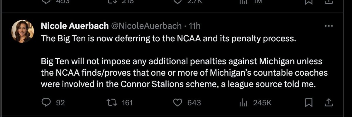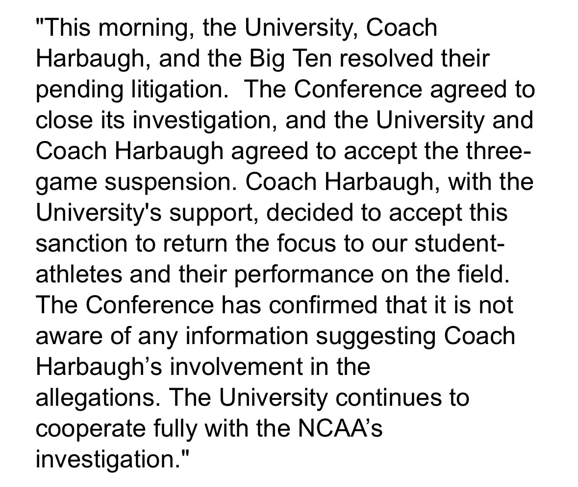 1. The UM statement explicitly states the conference has "closed its investigation" but the Big Ten statement says nothing of the sort. @NicoleAuerbach tweeted that her Big Ten source said the conference would defer to the NCAA but subject to a massive, massive caveat around whether the NCAA finds that "countable coaches" knew of the scheme.