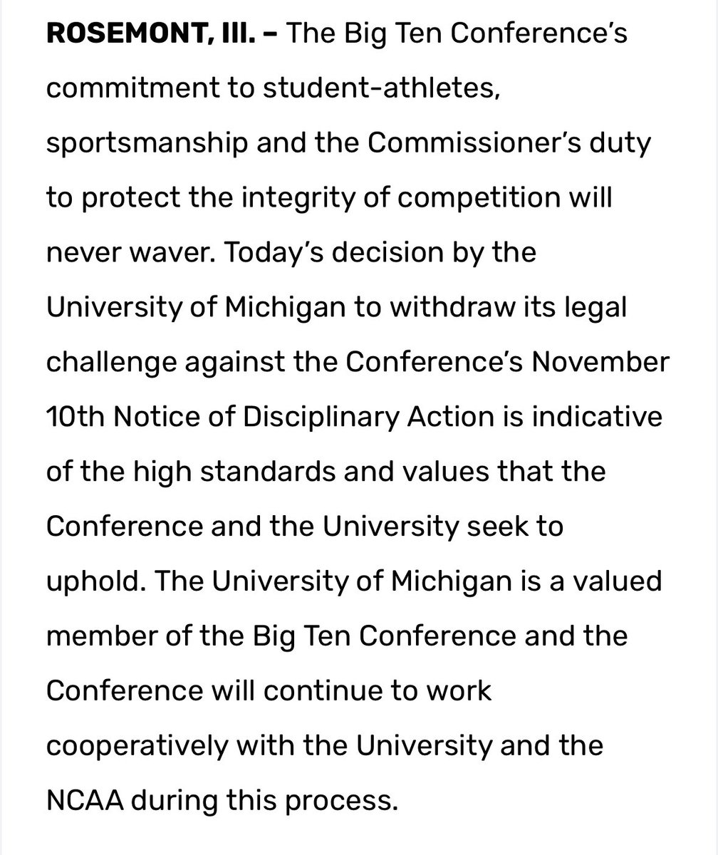 2. The UM statement refers to a mutual resolution of litigation while the Big Ten Statement refers to UM "withdrawing its legal challenge."
