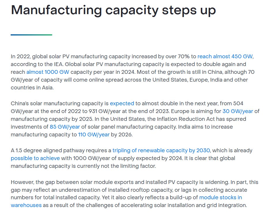 L'Inde prévoit une capacité de production de 120 GW d'ici 2026. Ce pays a installé environ 20 GW en 2022, et même si le rythme d'installation devrait fortement croître dans la décennie, ce pays devrait devenir exportateur net d'ici 2030.