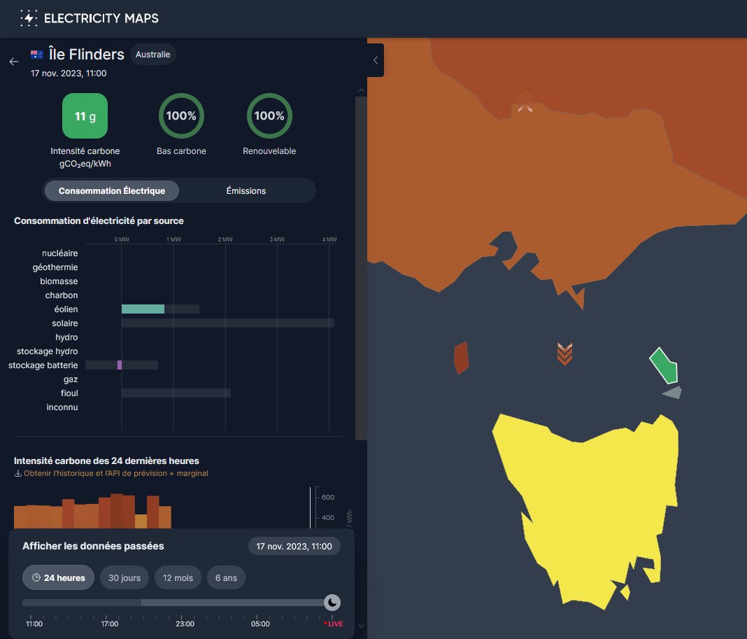 1️⃣ Flinders Island, une île non interconnectée au réseau australien, au nord de la Tasmanie (environ 922 habitants en 2021). Au moment où j'écris ce post à 11h AM le 17/11/2023, le mix est à 100 % EnR en instantanée : le réseau est stable.