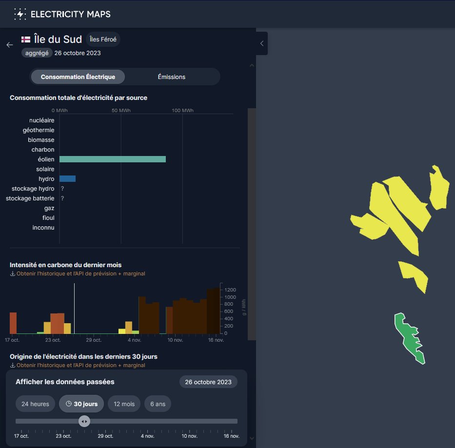 3️⃣ Ce même constat peut être effectué sur l'île de Suðuroy (îles Féroé, 4600 habitants / 163 km2, non interconnecté). Entre le 26 octobre 2023 et le 1er novembre, le mix électrique est resté à 100 % EnR (avec un peu d'hydro).