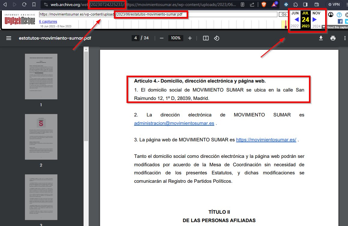 Si nos vamos a que recopila el historial de como estaba una web en determinadas fechas podemos volver atrás al 7 de noviembre y ver que sí que estaban sus estatutos con domicilio social subidos al menos a fecha del 24 de julio 2023