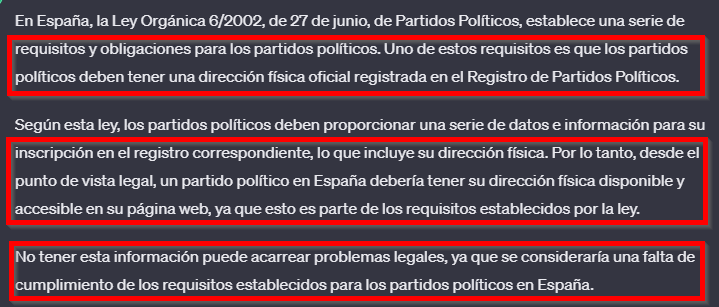 En España, la Ley Orgánica 6/2002, de 27 de junio, de Partidos Políticos, establece una serie de requisitos y obligaciones para los partidos . Uno de ellos es que los partidos políticos deben tener una dirección física oficial, no tenerla puede acarrear problemas legales.