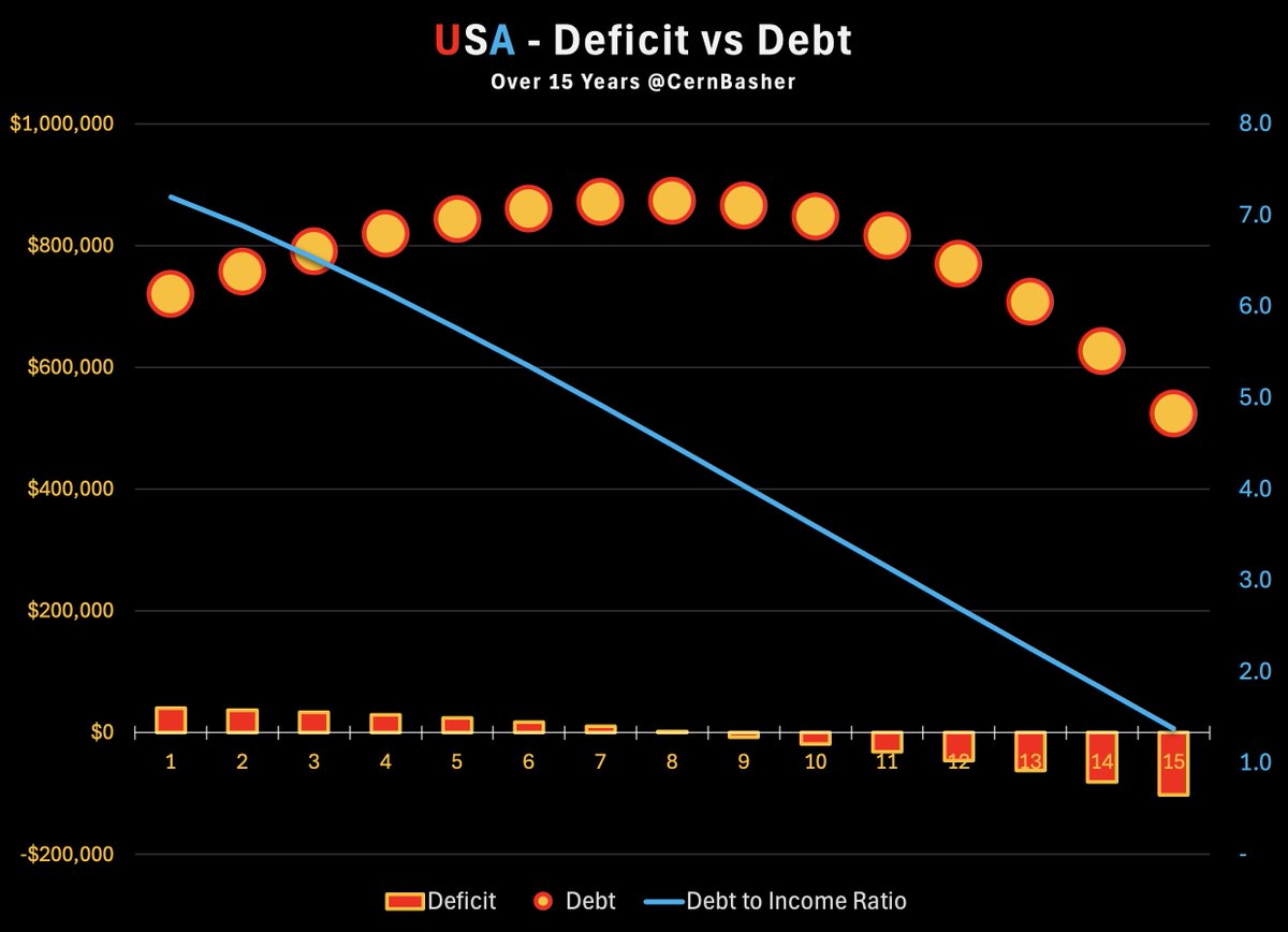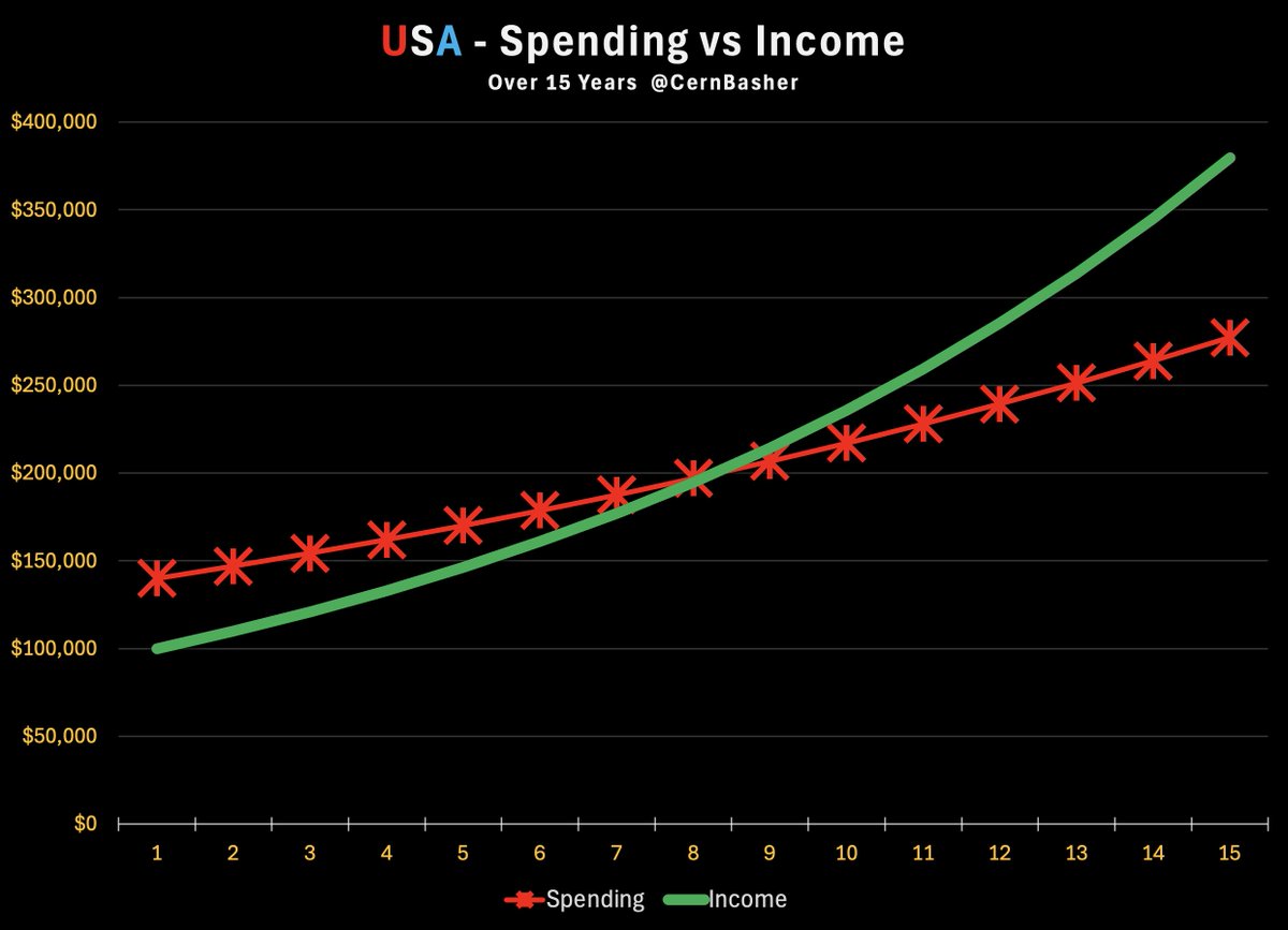 Let's say we find ways to accelerate GDP growth (via AI and humanoid bots and with the full support of government) and this leads to a 10% increase in annual income, while spending only grows by 5%.