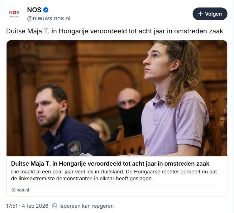 "Duitse Maja T. in Hongarije veroordeeld tot acht jaar in omstreden zaak", kopt de @NOS boven een artikel van @CWaaijers. "Maja T." heet in werkelijkheid Simeon T. en maakt deel uit van Antifa Ost (ook wel: #Hammerbande). Ook is het opvallend dat de @NOS "omstreden" gebruikt. 1/9