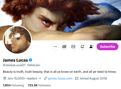 James Lucas (@jameslucasit) celebrates beauty in all its forms, exploring topics such as art, history, photography, architecture, culture, and nature. Follow him to stay updated on his threads, offering daily doses of beauty and an ongoing visual and thought-provoking journey.