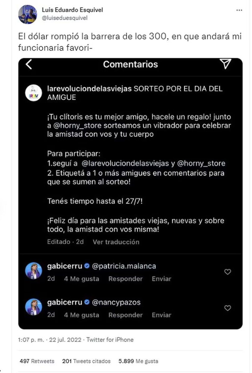 Cuando la portavoz Gabriela Cerruti participó en el sorteo de un juguete sexual por el Día del Amigo y arrobó a Nancy Pazos en Instagram