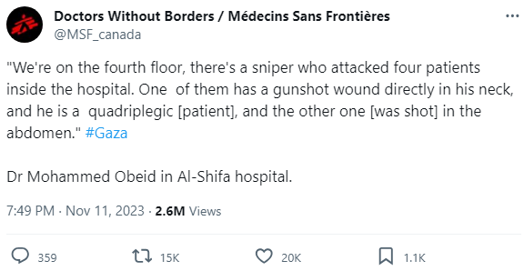 Israel has every hospital in Gaza surrounded with sniper drones that are firing at anyone they see. This is the stuff from dystopian novels and movies that Western audiences love so much, except it's real, and their governments are funding it and media is justifying it